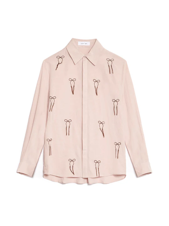 Introducing the Embroidered Bow Shirt, a regular-fit essential crafted from soft woven fabric. This shirt features charming placement bow embroideries with hanging lengths, adding a whimsical touch. It's a versatile addition to your summer wardrobe. Perfect for effortlessly adding personality and style, it's easy to mix and match, making it an ideal choice for any occasion.
